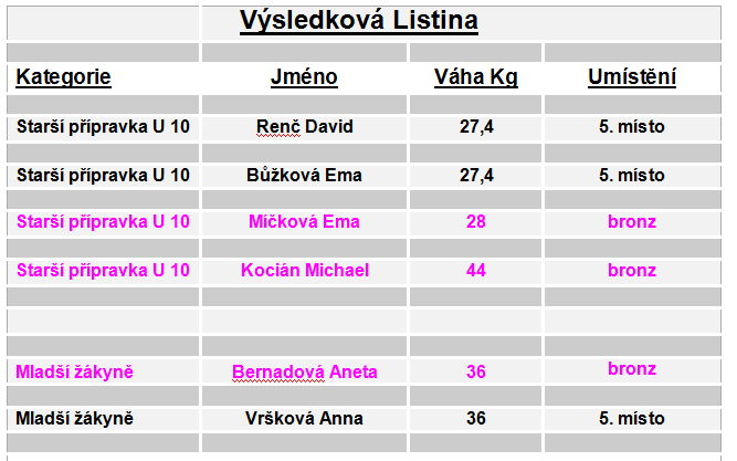 a páté místo Anna Vršková obě ve váze do 36 Kg.